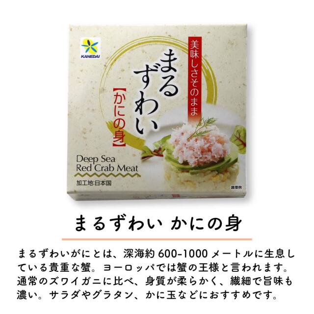 まるずわいがに(ナミビア産)、砂糖、食塩/調味料(アミノ酸等)、リン酸塩(Na)、増粘剤(キサンタン)、酸化防止剤(亜硫酸塩)
