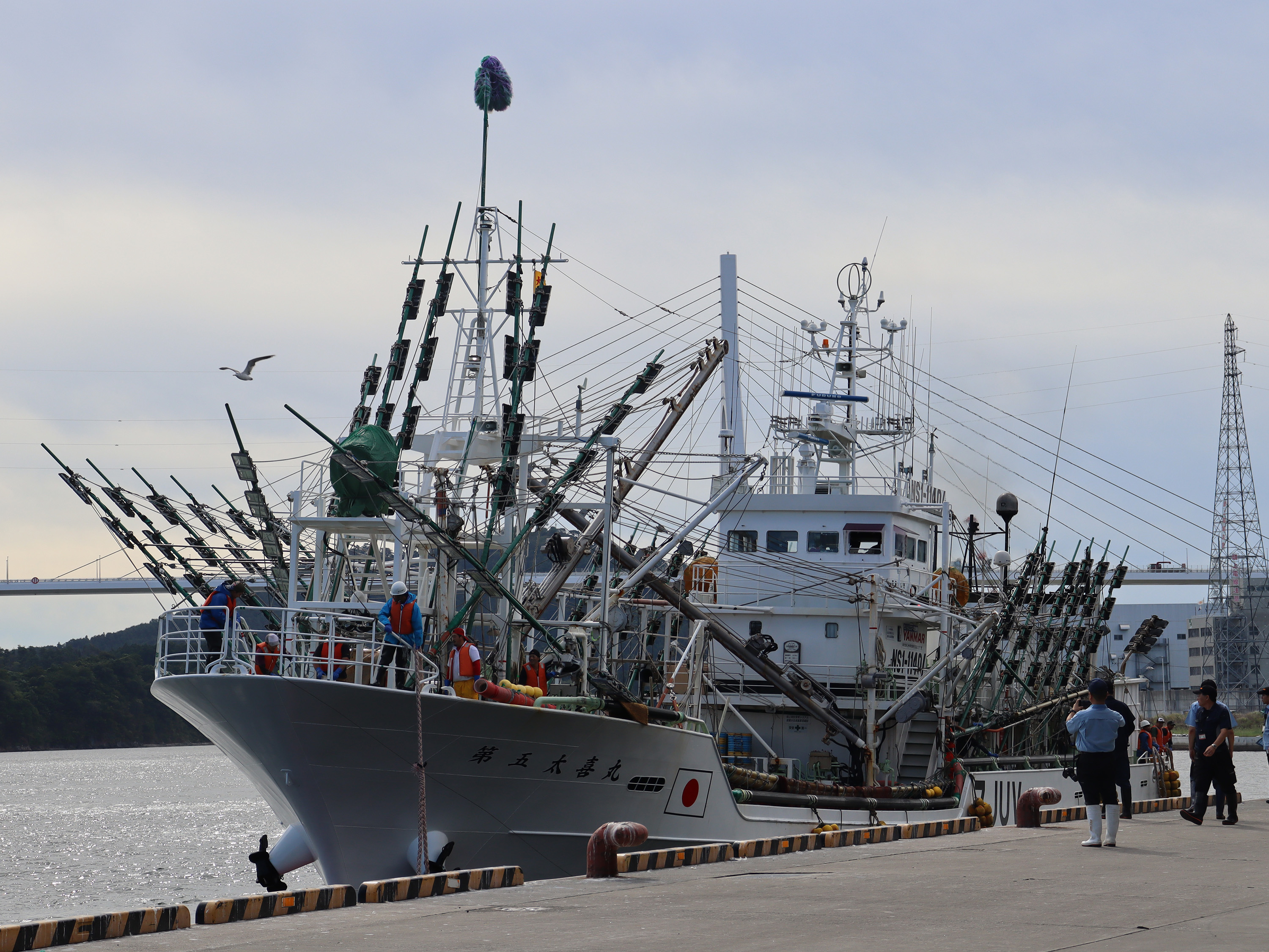 早朝、初水揚げを祝うセレモニーが開催され、気仙沼市長をはじめ漁業関係者や加工業者など、多くの関係者が気仙沼港に集いました。